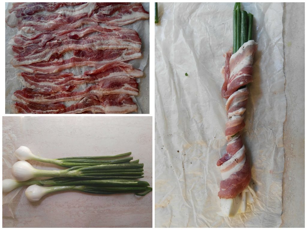 • Ask your trusted butcher to slice very thin slices of pancetta, about 3–4 mm thick (approximately 1/8–3/16 inch). The cut is the rib end, but boneless. Lay them out on a tray and season with pepper and salt. Clean the scallions by removing the tops, the tougher outer leaves and the roots; choose the thinner ones or cut them into smaller pieces if needed. Roll each slice around a small bunch of scallion. Grill on the barbecue or bake at 392°F for 15–20 minutes or until nicely golden and crisp. Remove from the oven and serve immediately.