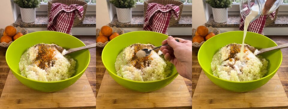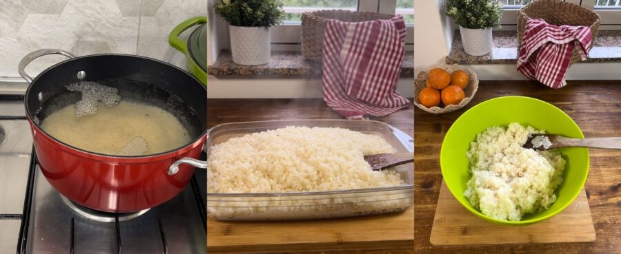 Cook the rice for about 10–15 minutes in lightly salted water and turn off the heat a few minutes before it’s fully cooked; many prefer to use milk instead of water — it’s a more modern, pastry-style variation and works well. Do not drain it; let it rest for 5 minutes so it absorbs the remaining liquid, then transfer it to a large baking dish to cool slightly. When the rice is warm and dry, gather it into a bowl and add: