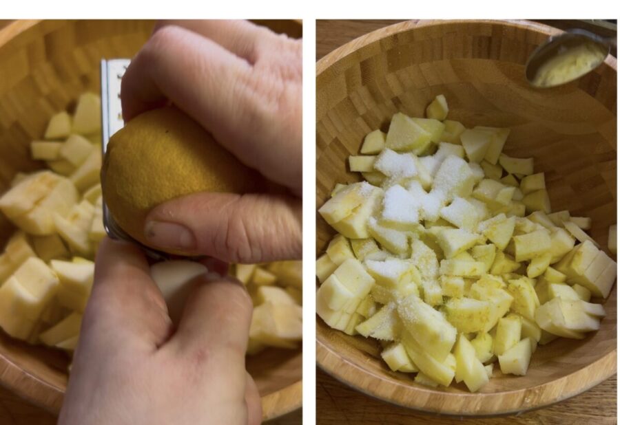 • Start by preparing the filling: peel the apples and cut them into very small pieces, place them in a bowl with the lemon zest, the sugar and the lemon juice. Mix.