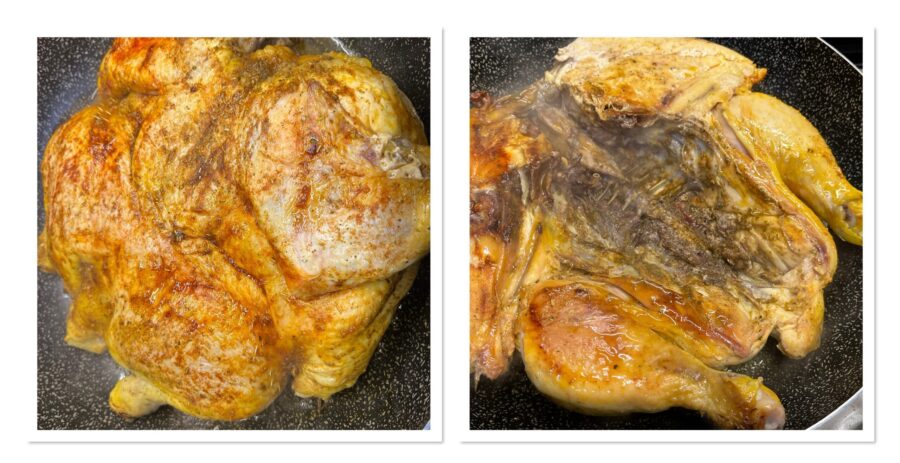 • Cook over very low heat for about 30 minutes without moving it, then turn the chicken very gently and cook the other side. This way you’ll get a nice crispy golden crust on both sides. Make sure the weight presses the chicken firmly onto the pan so the browning is perfect. During cooking you should never flip or move the chicken. If too much liquid forms, remove the parchment and foil and let it evaporate over a slightly higher heat.