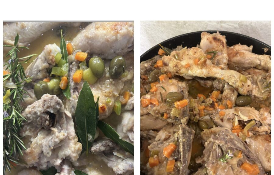 Chicken cacciatora in white — my grandmother’s recipe of a classic of Italian cuisine, just like the Roast whole chicken in the oven with potatoes. The chicken cacciatora is one of the most loved meat mains in Italian cuisine: easy, tasty and simple to make, it represents the classic Sunday dish that pleases both adults and children. Today, however, I want to tell you about a slightly different version of the traditional cacciatora, a variant perfect for those who don’t like tomato sauce, but just as flavorful: white chicken cacciatora with olives, as my grandmother prepared it. As in the original version, the base here is a soffritto of celery, carrots and onions, which together with the aromatic herbs will give the chicken its unmistakable delicious flavor. You can make this recipe with any part of the chicken, but I chose thighs and drumsticks because they are juicier, meatier, tender and flavorful and especially because they are the parts my children love the most! Now let’s go to the kitchen — I’m sure you’ll enjoy my grandmother’s white chicken cacciatora with olives from the very first taste, and I’m equally sure no one will resist mopping up the delicious savory sauce at the end. Also, this is an excellent stovetop chicken recipe! If chicken cacciatora, as delicious as it is, isn’t the recipe you’re looking for and you’d like other ideas on how to cook chicken, try Mediterranean-style chicken breast with onions and sun-dried tomatoes, or Beer-braised chicken in a casserole, or Oven-roasted chicken with potatoes and onions. Let’s head to the kitchen, but before we start cooking, remember that if you want to stay updated on all my recipes you can follow my Facebook page (here) and my Instagram profile (here).