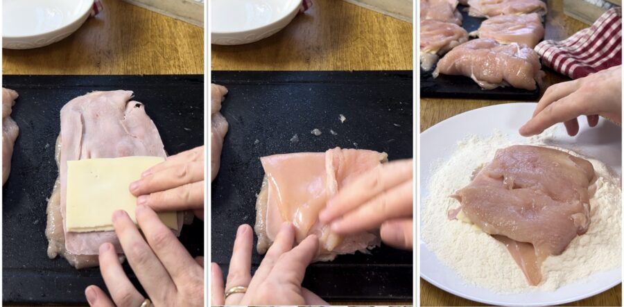 Place a thick slice of cheese at the base of each cutlet and fold the top part over it so that both the ham and the meat fully enclose the cheese. Once all cutlets are folded “like a wallet,” dust them with flour.