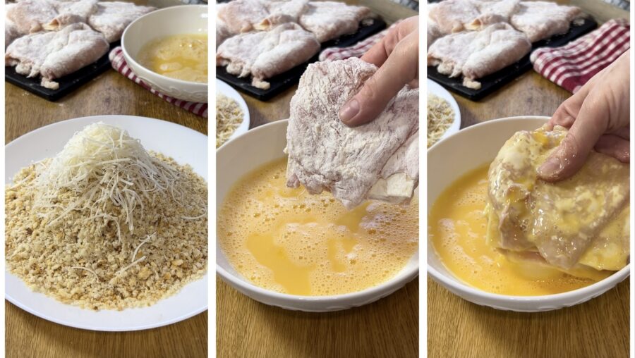 Prepare a breading mixture with the grated cheese and breadcrumbs, then dip the cutlets first in the egg.