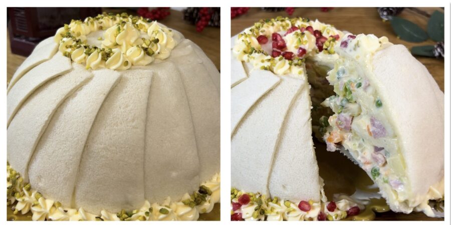 After the resting time, unmold the zuccotto and using a piping bag decorate with mayonnaise, then add color with pistachio crumbs and pomegranate seeds.