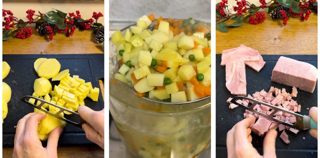 Meanwhile peel and rinse the potatoes, add them to the boiling water together with the peas and carrots and cook for another 5–6 minutes. Taste a potato and if they are tender but not overcooked, drain everything and transfer to a plate to cool completely. Cool the vegetables, then cut the cooked ham into cubes. (Keep in mind that once drained, the hot vegetables — especially the potatoes — will continue to cook from residual heat).