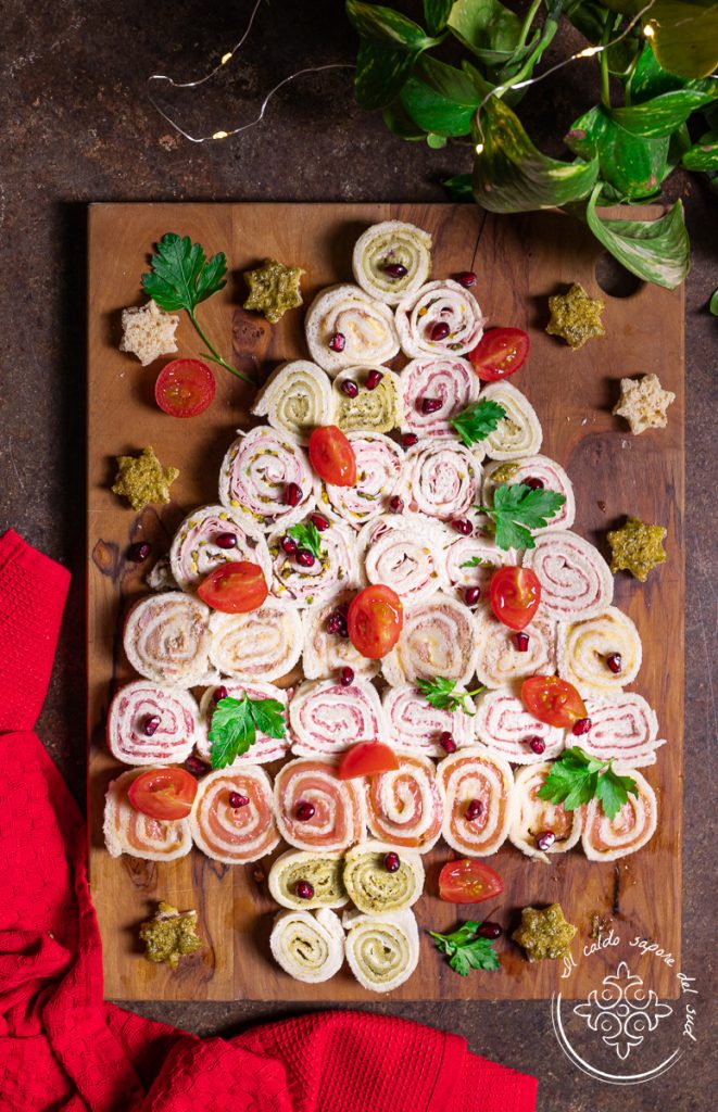 Christmas tree appetizer made with sandwich bread, a festive starter on a board created from many filled pinwheels of rolled sandwich bread sliced into rounds. As you know, there are no Christmas parties without appetizers and when December arrives the search for appetizers to impress begins — easy, scenic and delicious! I really love preparing them; festive Christmas appetizers are my favorite part of the holidays and I’m crazy about those made with sandwich bread, which in my opinion are the simplest and always the most delicious! Spreading fillings on sandwich bread is really very easy: it goes well with everything, it’s versatile, economical and liked by most people. In preparation for the holidays I tried some new ideas to bring to the table for Christmas and New Year’s and thought of making a Christmas tree from sandwich bread pinwheels, a tasty festive finger food, filled in different ways, just like a gourmet panettone.