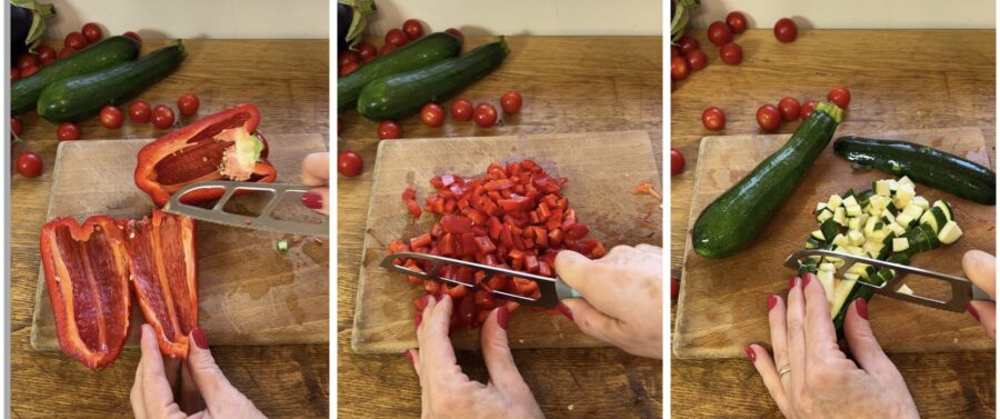 Rinse the bell pepper, remove the stem, seeds and membranes, slice it into strips and then dice into very small cubes. Rinse the zucchini, trim the ends and dice.