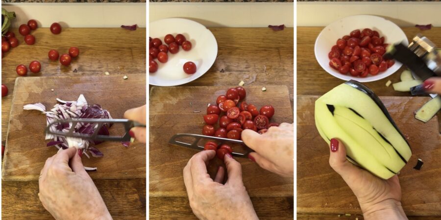 Peel the onion, rinse and slice finely, then cut the cherry tomatoes in half. Peel the eggplant so it does not release its color, slice, then cut into strips and finally into small cubes.