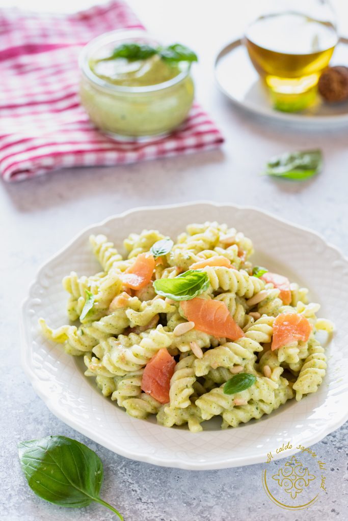 Cold pasta with zucchini and salmon, or better with zucchini pesto and salmon, a summer first course perfect to be enjoyed hot, cold or at room temperature — a very quick, light and tasty dish ideal for many occasions and the reason I added it to my collection of Quick summer pastas. Some time ago I had a busier day than usual and I already knew from the morning that once I left the house I would be out all day. So before leaving I thought to prepare lunch in advance and make a cold pasta: my children would find it when they got back from school and my husband would have it for dinner. In the fridge I had some zucchini and smoked salmon; I improvised a quick zucchini pesto with basil, cheese and pine nuts and used it to dress the pasta together with the smoked salmon: zucchini and salmon are truly an ideal combination and let you prepare an exceptional one-dish meal with the pasta! For my cold pasta I chose fusilli, perfect for catching the dressing, and short pasta holds its texture well and even when cold never goes soggy. That’s what I did, and at lunchtime my children phoned to compliment me: my cold pasta with zucchini pesto was delicious and very aromatic and it was still so good at dinner that even my husband ate it all in a flash!
