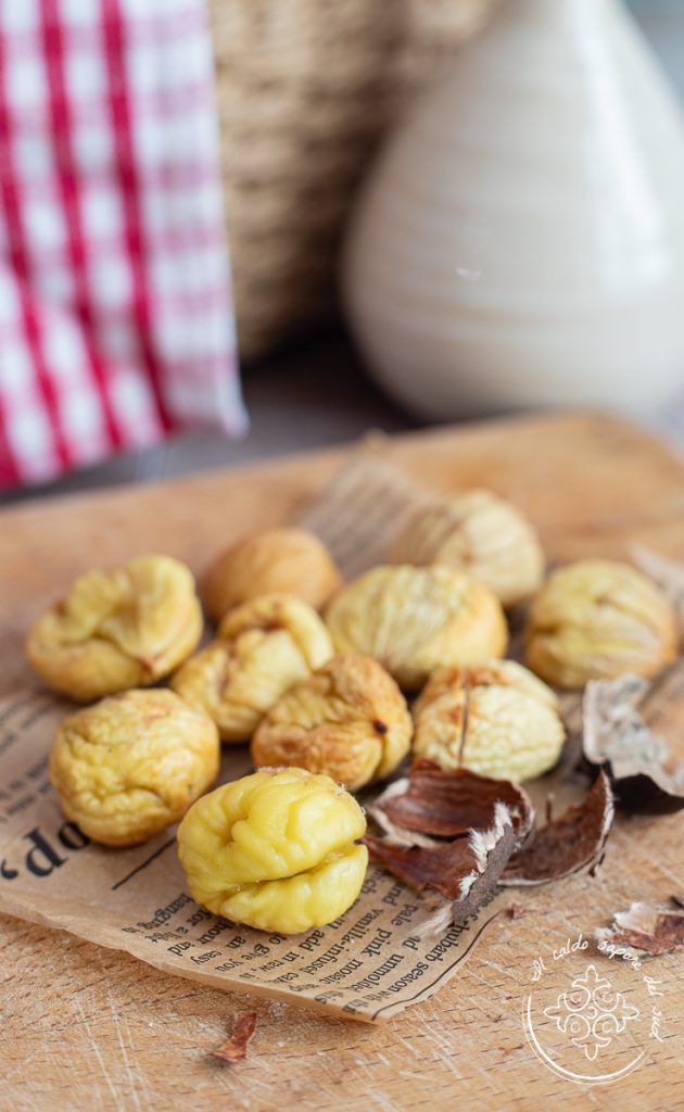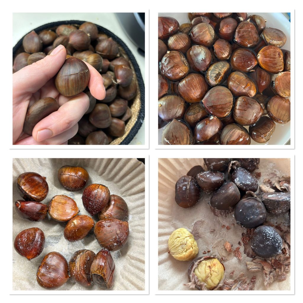 As with all chestnut cooking methods, I recommend, if you can, after purchasing them to leave them to dry in the sun for a couple of days. This way the skin that wraps them will come off more easily.