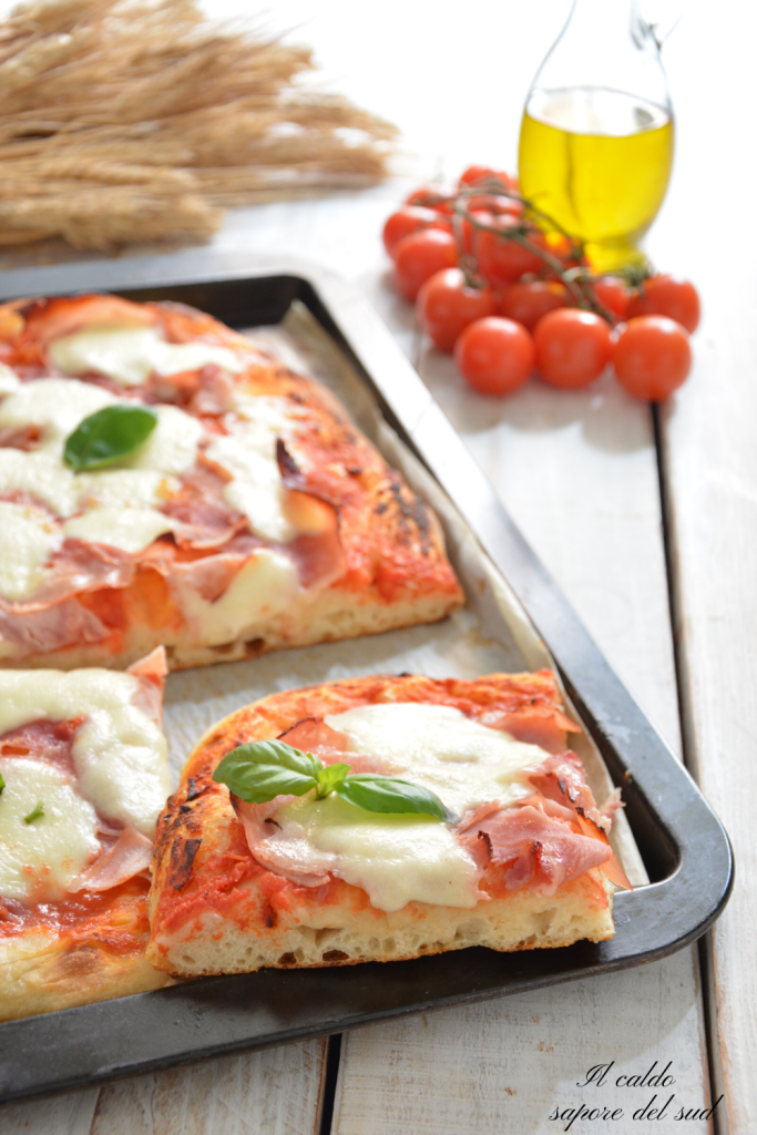 Have you ever tried making sheet-pan pizza at home? If you have never attempted the lovely experience of making a crispy sheet-pan pizza with your own hands, you really should try it, because homemade pizza, besides being very tasty, brings enormous satisfaction. I often prepare my quick sheet-pan pizza but when I can plan ahead I also make the long-fermentation sheet-pan pizza, crispy outside and super soft inside. How to make a sheet-pan pizza with a long-fermentation dough? I assure you it’s very easy and doesn’t require heavy work, just a bit of organization. And the result is really, really good — trust me, you’ll see that the long wait for the dough to mature will be amply rewarded by the taste of a pizza crispy outside, soft inside, with an open crumb and moreover a long-fermentation sheet-pan pizza is digestible, delicate, light and flavorful.