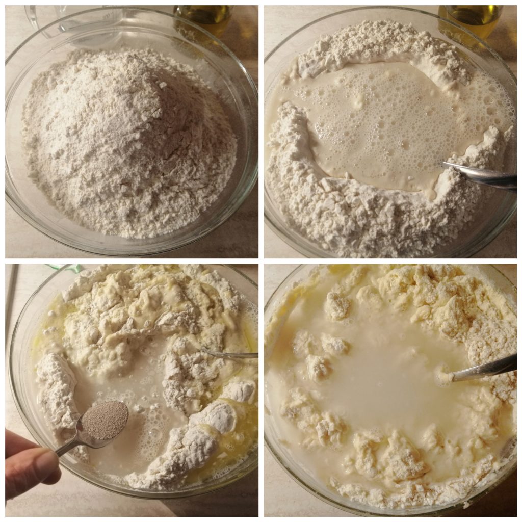 Put the flours in a bowl, add one-third of the water and the oil and mix; add a little more water and add the yeast and sugar, mix, and finish with the last part of the water and the salt.