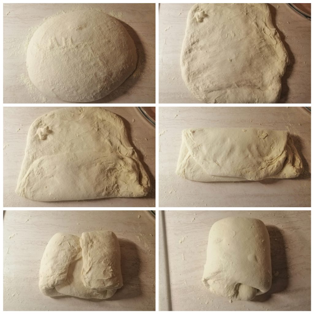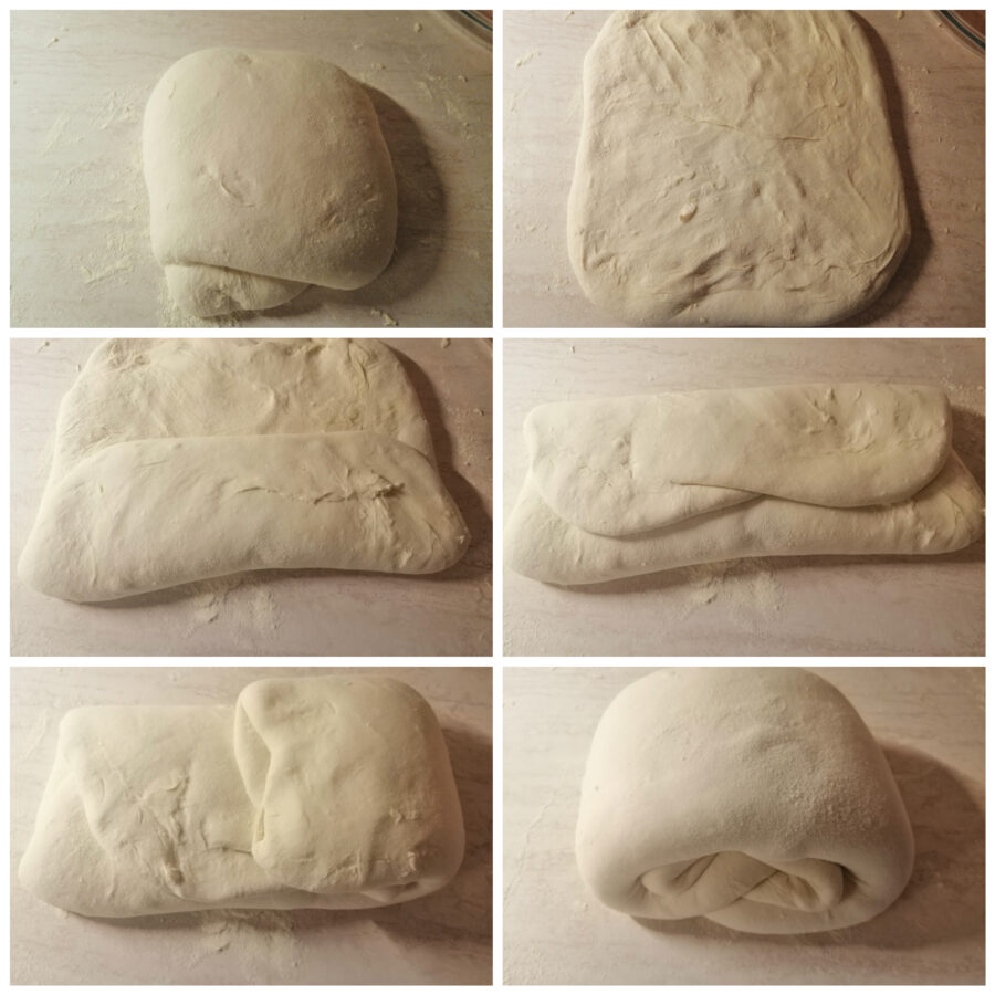 After resting, flour the work surface well, stretch the dough with your hands and form a rectangle, perform letter folds (like a wallet) as in the photo and set aside covered for 10 minutes.
