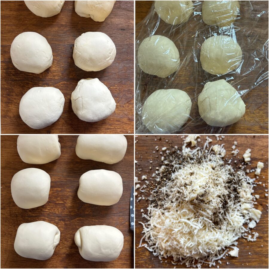 Work each piece into a ball and let rest at least 2 hours in a warm place, covered with plastic wrap or until doubled. Prepare a mixture of cheese and black pepper and set it aside.