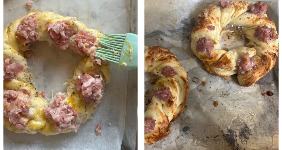 Then make little indentations in the “bread crowns” and fill them with pieces of sausage (freed from the casing) or well-drained, dry ricotta.