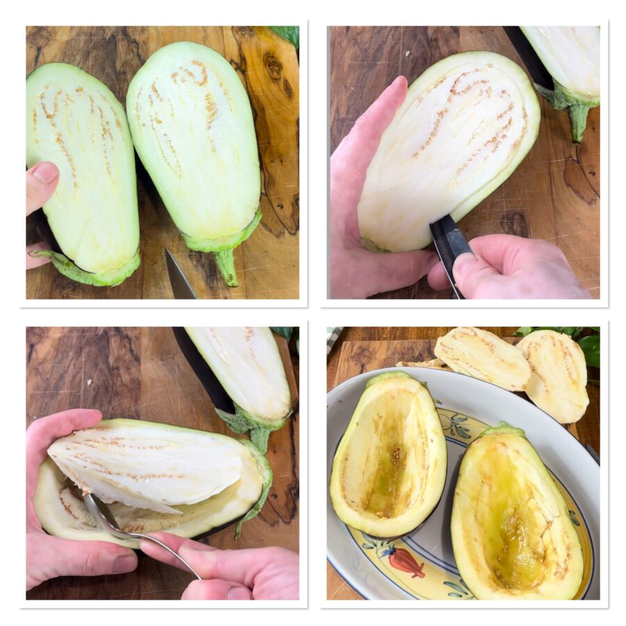 • Rinse the eggplant and cut it in half, leaving the stem attached. Using a knife, score the flesh and then scoop it out with a spoon, creating two boats. Cut the scooped flesh into small pieces and set aside. Place the boats on a baking dish, drizzle with olive oil, sprinkle with salt and bake in a convection oven at 392°F for about 15 minutes, or until slightly golden.
