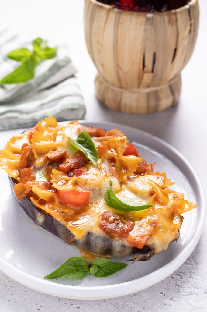 Baked eggplant stuffed with pasta, oven-baked eggplant boats filled with a gooey and indulgent baked pasta filling — a vegetarian recipe without meat or cured meats, simply delicious!