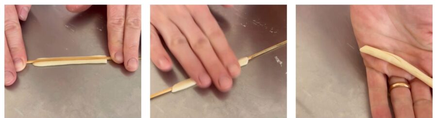 Divide the rope into equal pieces about 2 to 3 inches long and place a skewer on top of each piece. With a gentle pressure of the hand and a slow back-and-forth motion, make the pasta adhere to the skewer. Then carefully slide the pasta off the skewer and place it on a clean cloth (watch the video below for the full procedure).
