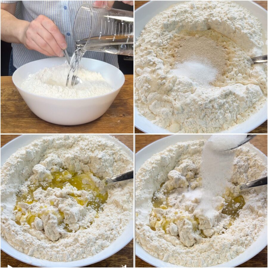 Add the oil and a little more water, mix and finish with the salt and the last portion of water. Work first in the bowl, then on the work surface until you obtain an elastic and uniform dough; this will take about 7–10 minutes (you can also knead with a stand mixer, but I do not recommend blade-type food processors like the Bimby: the dough will have difficulty forming a proper gluten network).