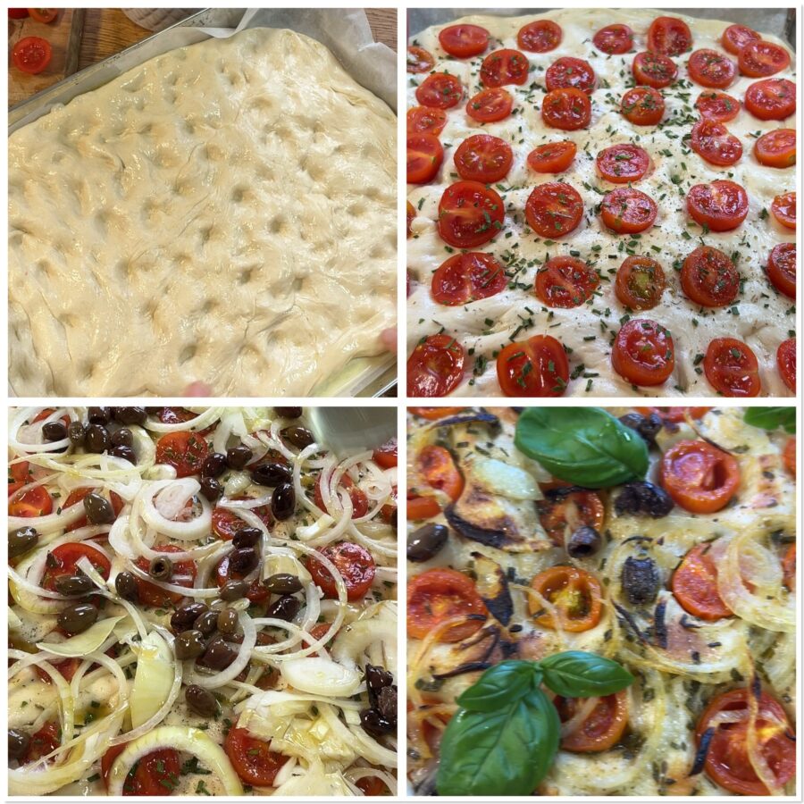 Preparation of the focaccia with onions, cherry tomatoes and olives
