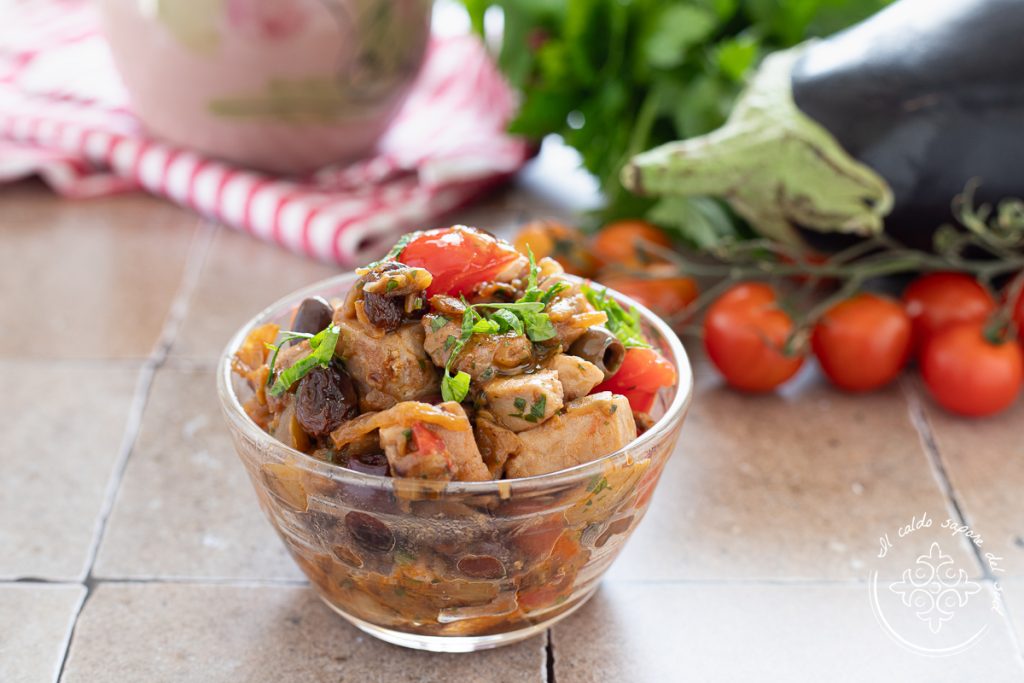 Fresh tuna with eggplants and cherry tomatoes, a simple and tasty sauce for pasta and an original fish main course. The fresh tuna sautéed in a pan with eggplants, cherry tomatoes and olives is an easy fish recipe, ideal as a sauce to dress a good plate of pasta and also great as a main course in a fish menu. If you’ve bought fresh tuna and don’t know how to cook it, this Mediterranean pan-seared tuna with eggplants is just right for you — you’ll see that in no time you’ll prepare a delicious dish! Before rushing to the kitchen, as always I remind you that if you want to stay updated on all my other recipes, you can follow my Facebook page and my Instagram profile.
