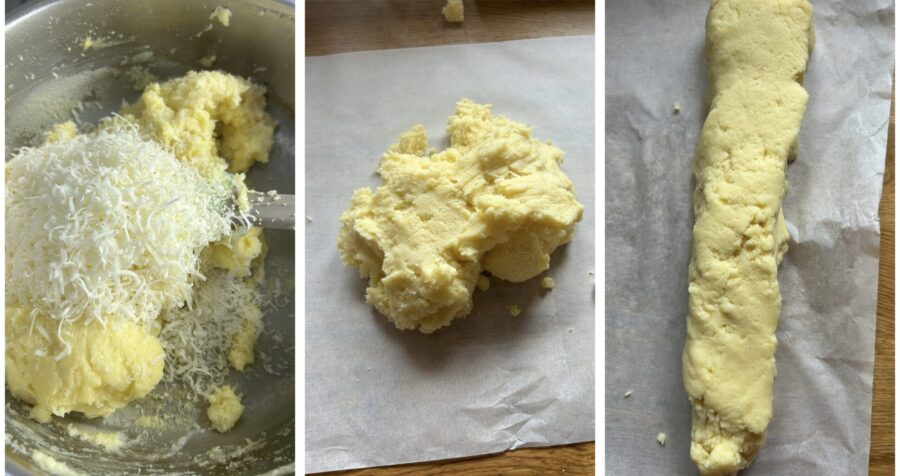 the grated cheese and mix again. Transfer the mixture onto a sheet of parchment paper, shaping it into a long, narrow log; wrap it in the parchment and shape it into a cylinder.