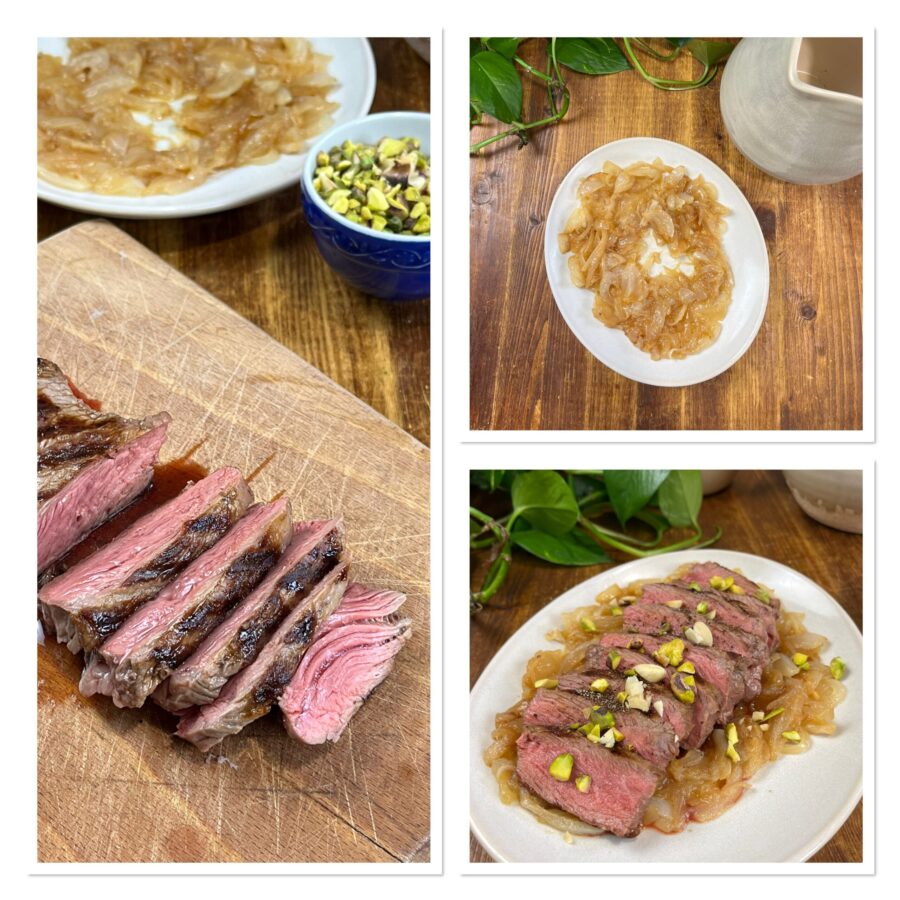 Grilled beef tagliata with caramelized onions and toasted nuts. How do you cook grilled beef tagliata? The tagliata di manzo is a classic main course: timeless, easy, quick and one of the best ways to enjoy pure beef. When well cooked, the tagliata di manzo is at once simple and chic, and in the recipe I’m about to describe I’ll serve it with caramelized onions and toasted mixed nuts, creating in one simple move a gourmet, flavorful main dish — in short, an alternative and original beef tagliata.