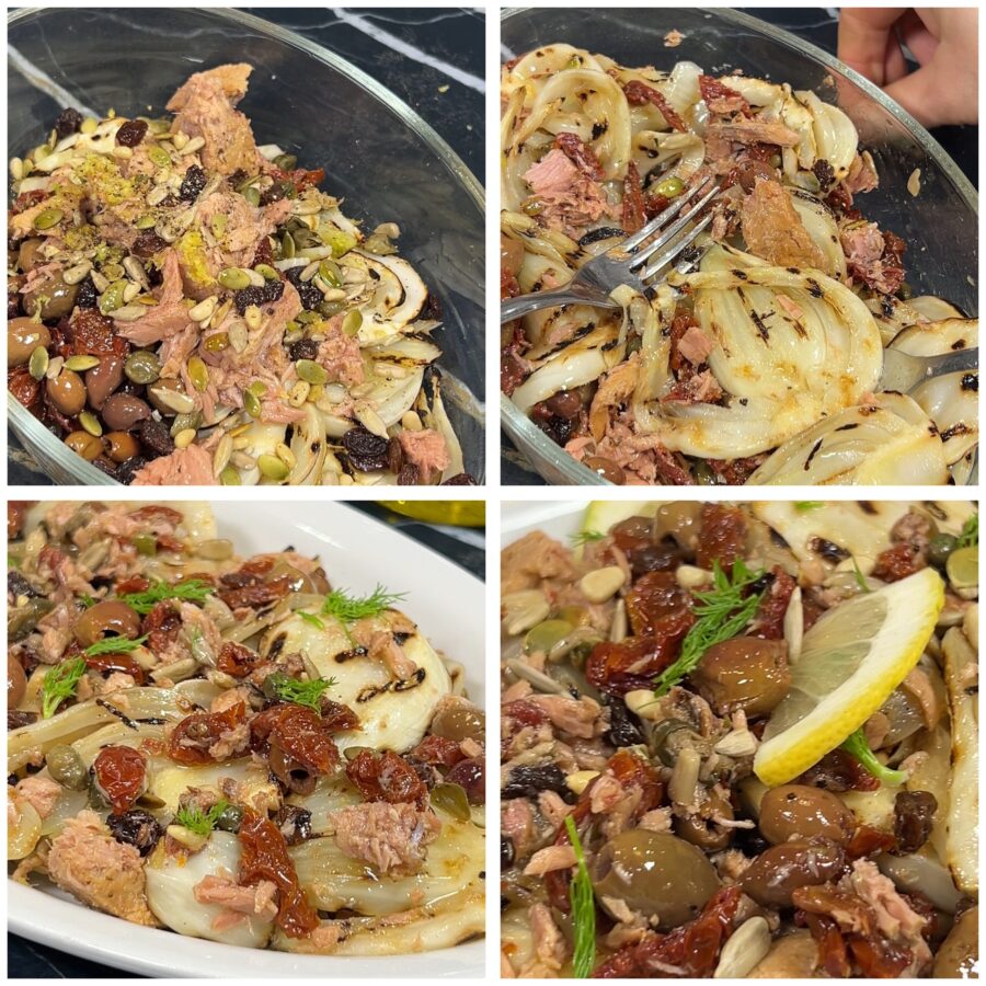 Grilled fennel with tuna, olives and sun-dried tomatoes is a simple but surprisingly flavorful dish, perfect for those who love fennel recipes. The grilling makes the fennel tender and slightly smoky, enhancing its natural sweetness, while the Mediterranean dressing – with tuna, olives, capers, sun-dried tomatoes, raisins and seeds – creates a harmonious balance of savoriness, freshness and aromatic notes.