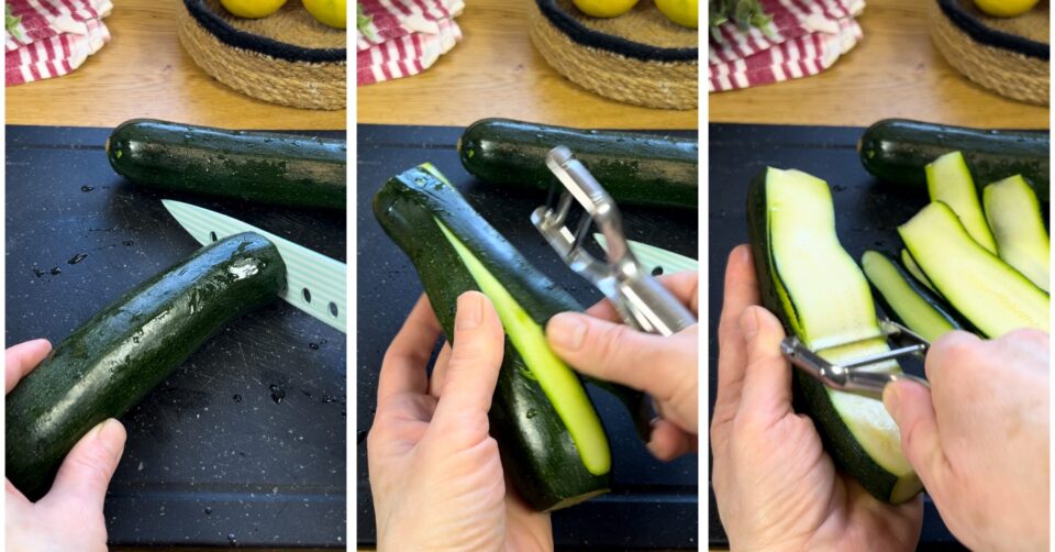 Rinse the zucchini and remove the ends. Using a peeler, remove a strip of skin from one side and the other (so the first and last slice won’t be fully covered), then with the same peeler slice as many very thin strips as you can.