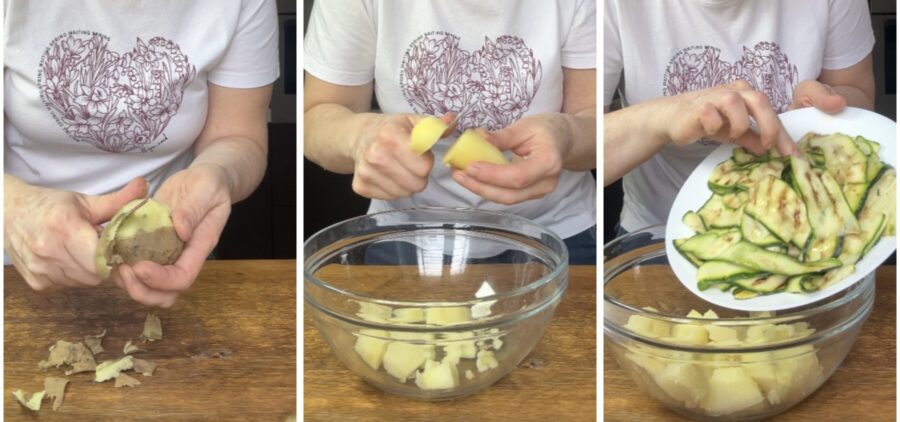 Peel the now-cold potatoes and cut them into chunks. Place them in a bowl together with the grilled zucchini,