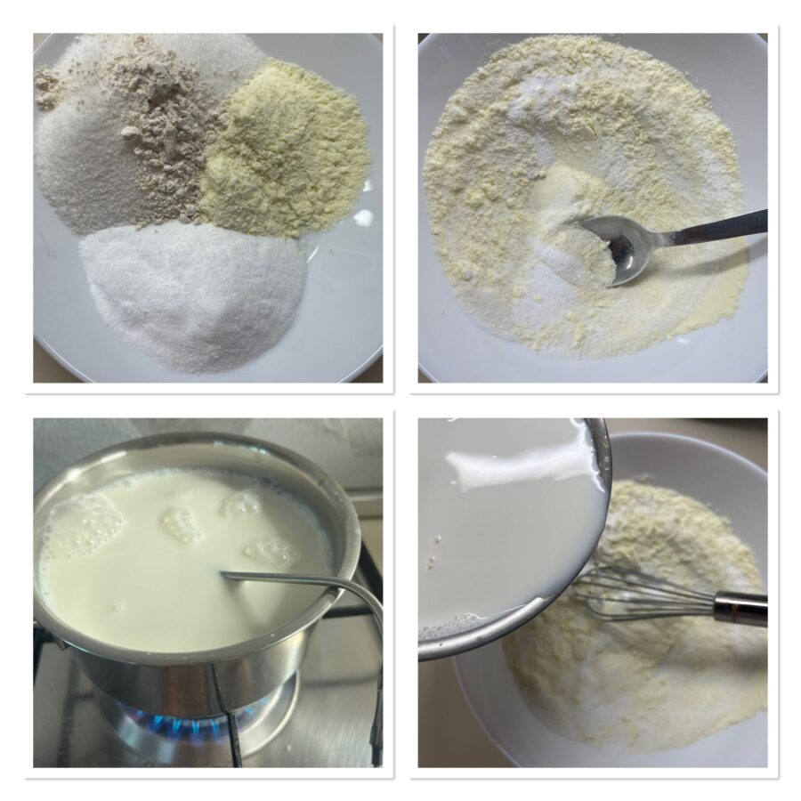 Gather all the powders in one container and mix them together. Pour the milk and cream into a saucepan, stir and bring almost to a boil — you should reach a temperature of 185°F.