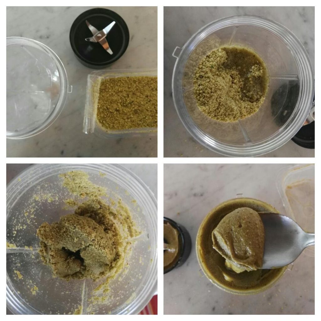 Put the flour or whatever you’ve chosen into the jar of your blender and add two tablespoons of vegetable oil. Start blending with short pulses, then continuously; with the heat generated by the blades’ friction the pistachios will begin to release their oil. At first the mixture will clump together, then gradually become smoother and creamier. If the paste, as often happens, struggles to come together, add one more tablespoon of oil, but don’t go beyond that (you risk ending up with a product that is too runny). The paste will be ready when it reaches a smooth consistency like in the photo. You can then use it to make ice creams, mousses, semifreddos and much more. The texture of the paste depends on the blender you use; with a blender like the one I recommended above (or a similar model), the result will be perfect.