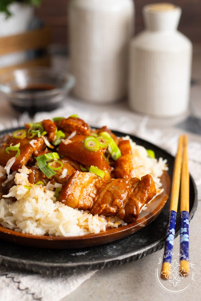 Let the pork belly cook for about 1 hour, until most of the water has evaporated and a dark sauce has formed on the bottom of the pan. Finally add the vinegar and the cornstarch to thicken the sauce.