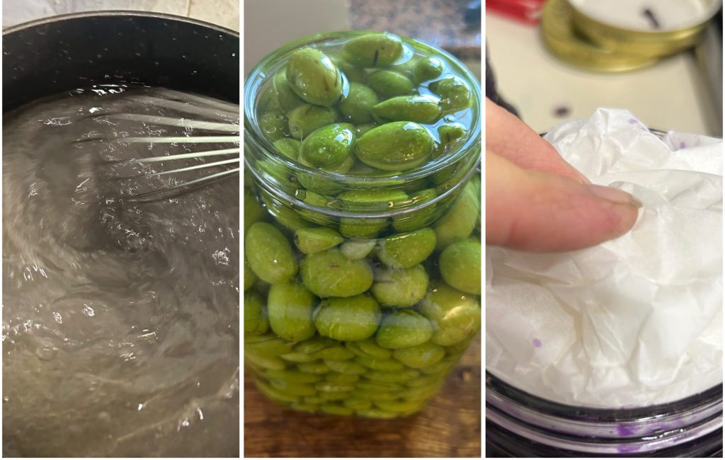 Collect the olives into the various jars and fill them to the brim, without pressing them. Pour the solution also up to the brim. Try to work over the sink or on a tray that can catch any liquid that falls. Now crumple a piece of parchment paper, lay it on top of the olives so they are covered, and once the lid is screwed on they must be completely submerged. Alternatively use the classic jar presses for preserves (if the solution is not enough for the jars used, prepare more with the same proportions). During maturation the olives will lose some of their bright green and will look like those in the photo.