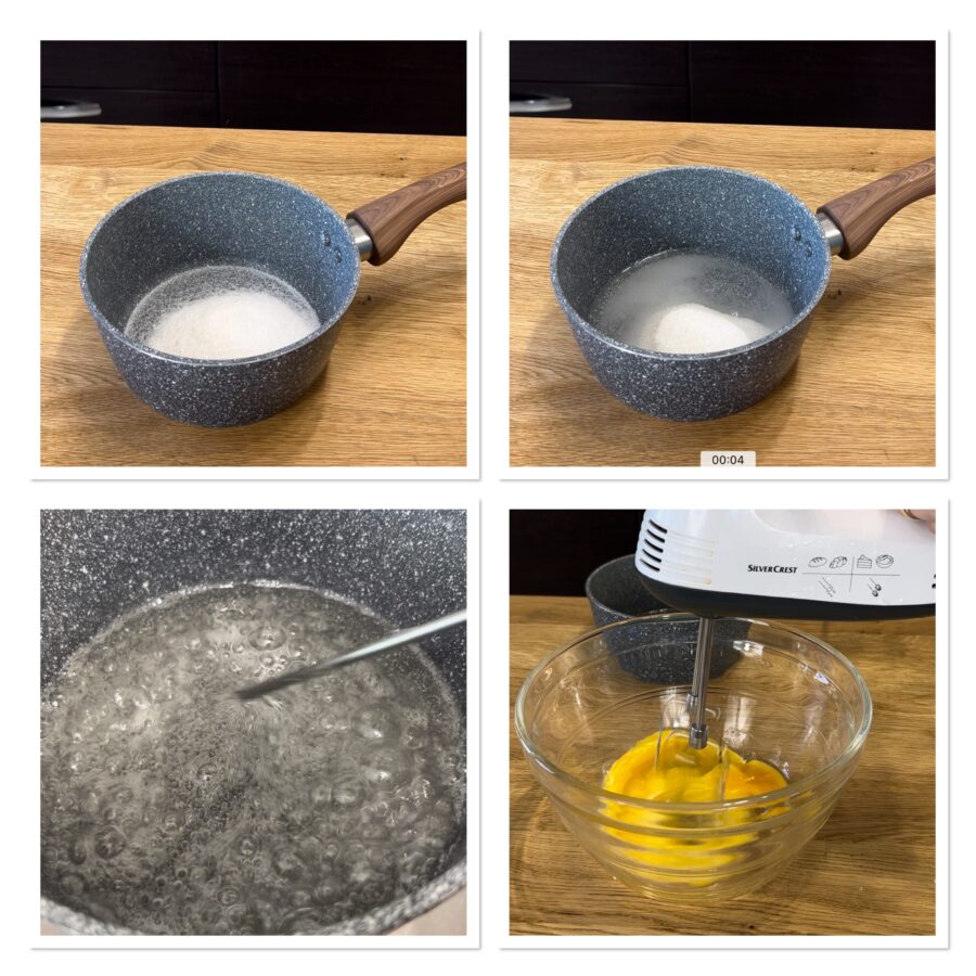 Let’s start by preparing the mascarpone cream. To make the mascarpone cream, pour the water into a small saucepan, add the sugar and place over the heat. Stir gently and bring the mixture to 250°F, measuring the temperature with a kitchen thermometer; if you don’t have one, the syrup will be ready when many small white bubbles form on the surface. Shortly before the temperature reaches 250°F — so around 239°F — begin whipping the whole eggs with electric beaters.