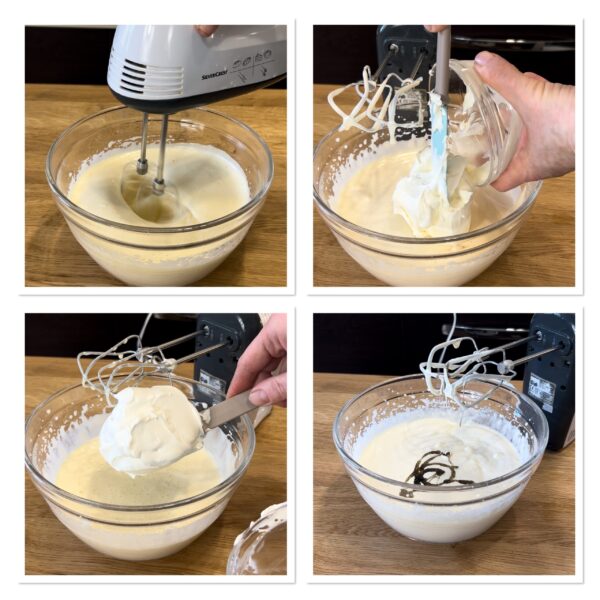 Once you have a cold, frothy mixture add half of the mascarpone and fold it in with the whisk, then add the other half and the vanilla extract.