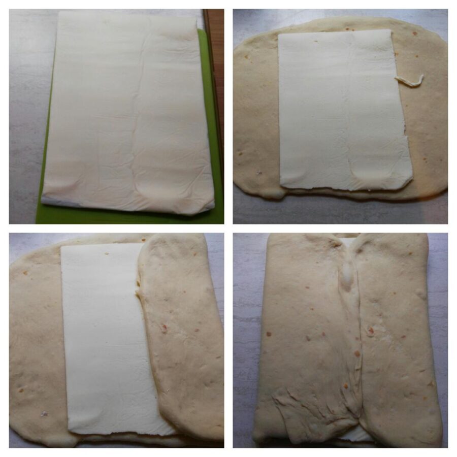 Gently roll out the dough with the butter enclosed to form a rather long rectangle, then perform a letter fold (threefold). You will have a rectangle — place it with the short side towards you and roll it out again into a long rectangle, fold into thirds once more and refrigerate for 30 minutes.