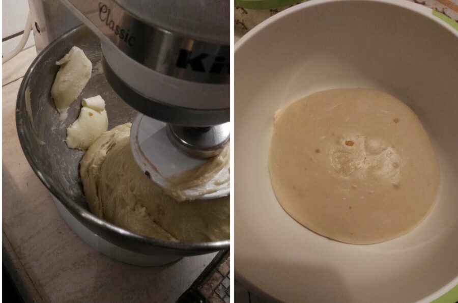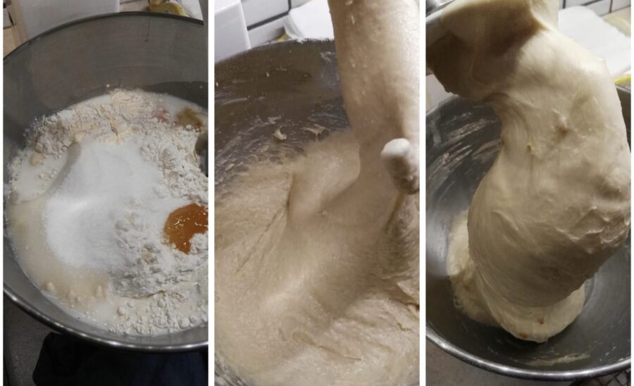 Take the sponge, break it into pieces and place it in the stand mixer together with the rest of the ingredients for the base dough, except for the butter, the orange paste and the salt.