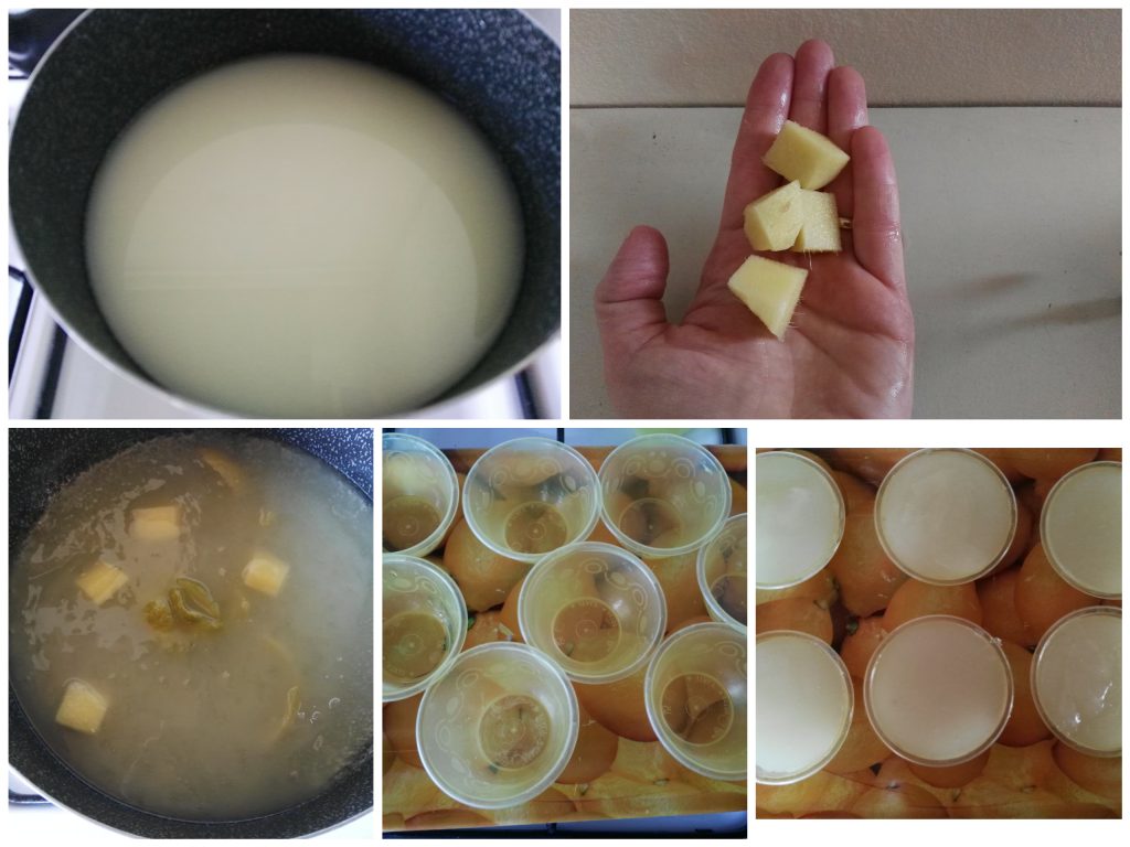 • Place the pot on the stove and, if you like the taste of ginger, add a few peeled pieces of ginger along with some of the lemon zest used earlier. Bring the mixture almost to a boil, stirring continuously with a whisk, then add the lemon juice, stir to combine, wait until the mixture thickens and remove from the heat.