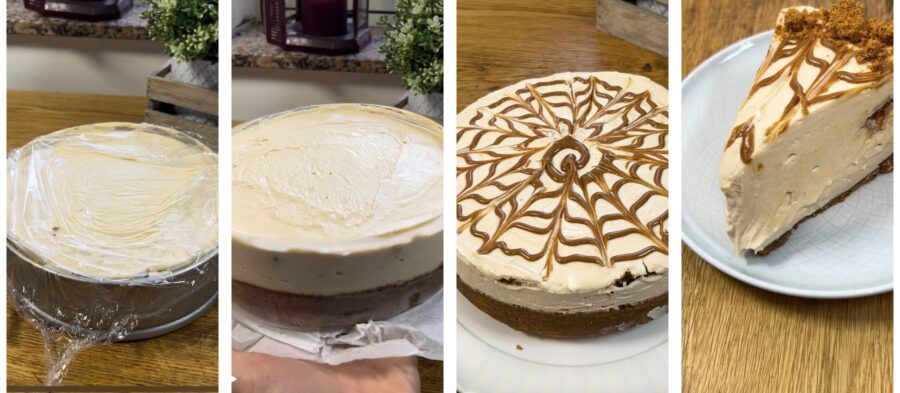 Line a 9 in springform pan with parchment paper on the sides and bottom (I use acetate strips for the sides) and pour in the cookie mix, then shape and press it with the back of a spoon and your hands to cover some of the edges as well. Place in the fridge.