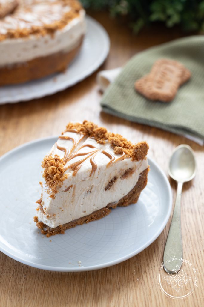 After the time has passed, unmold the cake, move it to a serving plate and decorate with Lotus spread and crushed cookies (you can find how to make the decoration here: Charlotte with dark chocolate mousse scented with orange).
