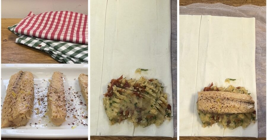 • Drain the mackerel fillets and season with pepper and lemon zest. Unroll the puff pastry and divide it into 4 equal strips the height of the short side of the rectangle. Spread some of the potato mixture at the base, shape it and lay the fillet on top.