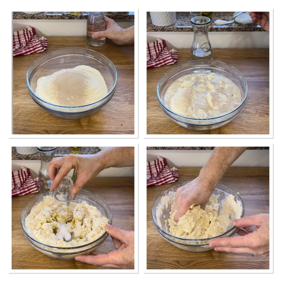 • Combine the two flours in a bowl. If you can’t find finely milled semolina, you can use only type 0 flour. Add the yeast, sugar and part of the water. Mix, then add the oil, salt and the remaining water. Work the dough in the bowl for a couple of minutes.