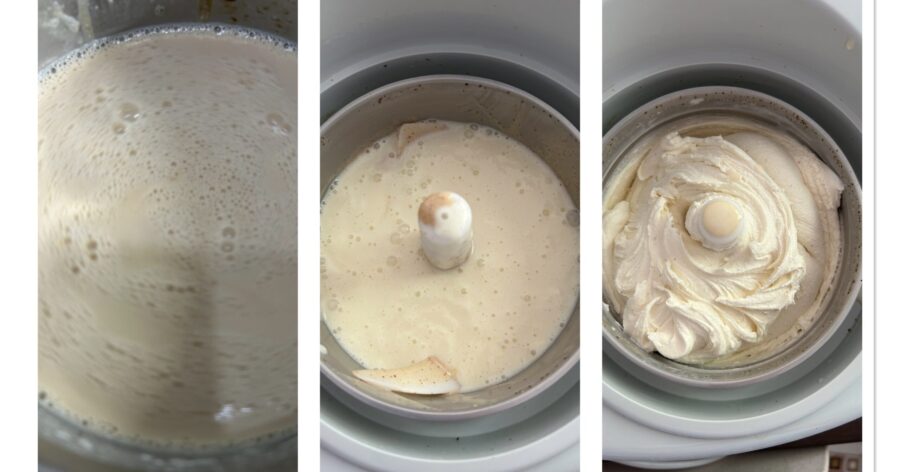 After resting, whisk the now-cold mixture, pour it into the ice cream maker and wait for the machine to reach the proper churning. Starting from a cold base, churning will take less time. For a good result, it’s ideal to use a compressor ice cream maker, because an insulated (accumulator) machine, especially on hot days, cannot maintain the proper temperature to make good ice cream. Accumulator machines also allow only one flavor at a time and the bowls must be kept in the freezer for at least 24 hours before reuse.