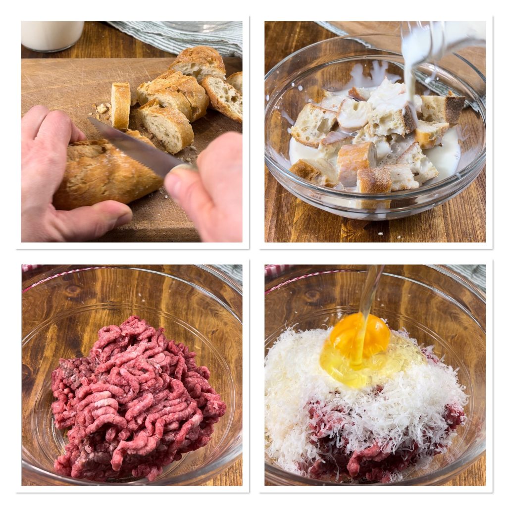 The grandma’s secret for super-soft meatballs is to add stale bread soaked in milk to the mixture, so start from that. Cut the bread into small pieces, cover with the milk, let it soften and crumble it with your hands, then squeeze it and add it to the ground meat placed in a bowl.