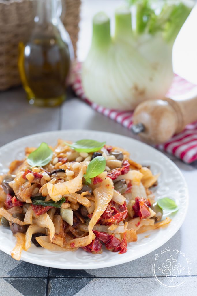 Mediterranean pan-fried fennel, a recipe for an easy fennel side dish, quick and tasty. Mediterranean fennel cooked in a pan is a savory and delightful side dish, colorful and very aromatic, perfect for any occasion — a vegan and vegetarian recipe that pairs beautifully with all kinds of main courses. Delicious like all the fennel recipes and similar to baked fennel gratin, these pan-fried fennel with sun-dried tomatoes, olives, capers and raisins are a simple and amazing dish you will prepare in 15 minutes. Mediterranean pan-fried fennel is a quick and tasty side dish you will love at first bite — want to try it too?