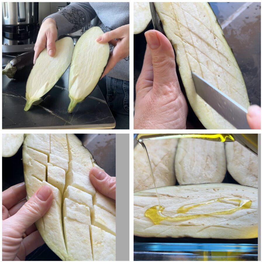 • Wash the eggplants, remove the stem and cut them in half lengthwise.