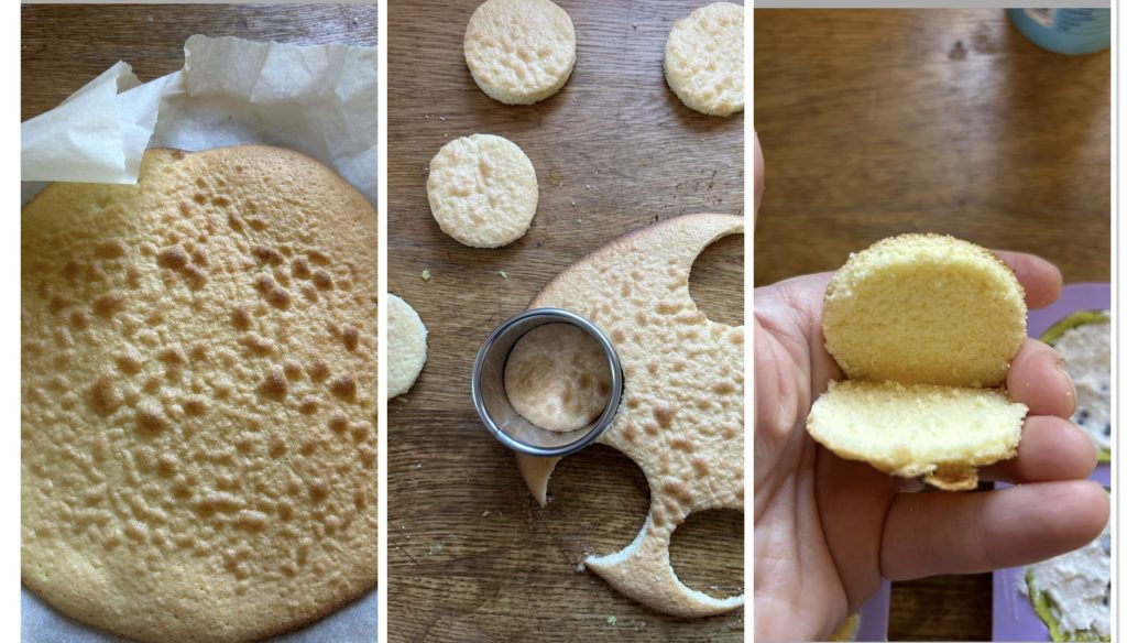 • Bake at 356°F for about 7 minutes, perform the toothpick test and remove from the oven. Cut out at least six discs matching the diameter of your molds (mine are 2 in), then halve them and set aside (you should end up with at least 12 small discs).