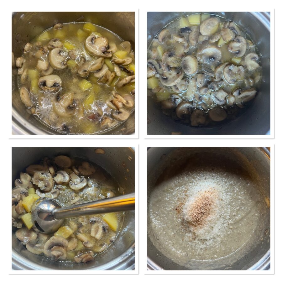 Once the mushrooms and potatoes are seasoned, pour in the water and cook over medium heat for about 20–25 minutes, then blend everything with a blender and, if needed, adjust the consistency by adding a little water and returning to the heat.