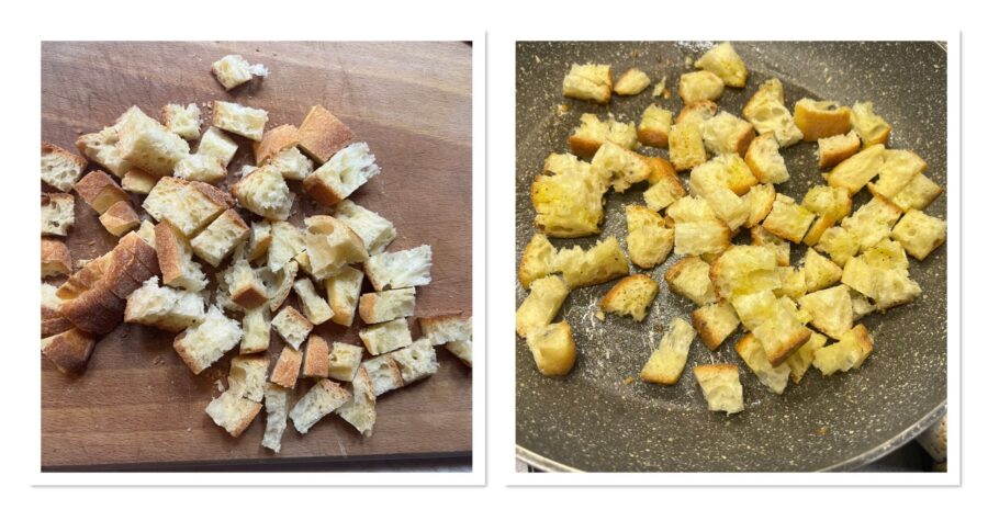 Place over medium heat and let them brown, stirring often and preventing burning. The croutons are ready.